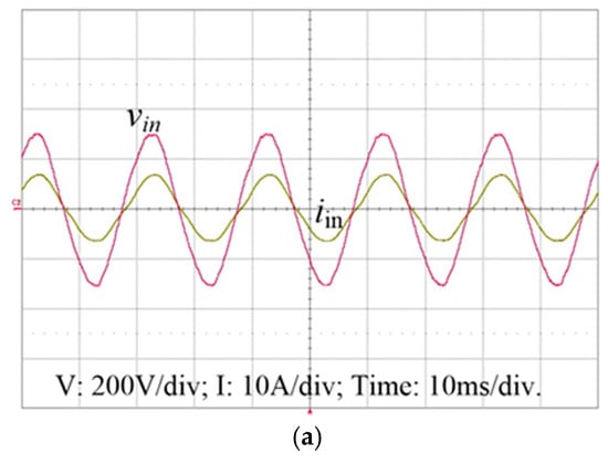 The utility input voltage and current waveform in normal mode of operation is shown in Figure 8a. The input is sinusoidal, with unity power factor and THD less than 5%. The output voltage and current waveform during linear loads and non-linear load are shown in Figure 8b,c. The waveform is sinusoidal for linear loads with THD less than 1%. For a non-linear load designed according to the standard of IEC62040-3, the THD is 1.25% [38].