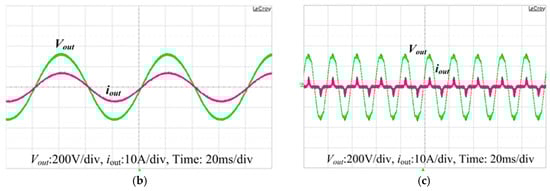 Experimental waveform of the input output voltage and current of the UPS system. (a) Input line voltage and current; (b) Inverter with linear Load; (c) Inverter with Non-linear load.