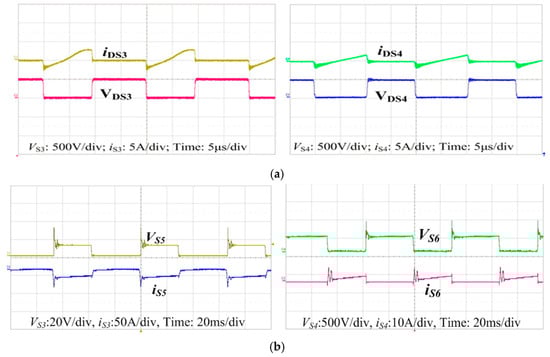 Drain to source voltage and current of the switches. (a) S3 and S4 of single-stage AC-DC Converter; (b) S5 and S6 of boost DC-DC converter.