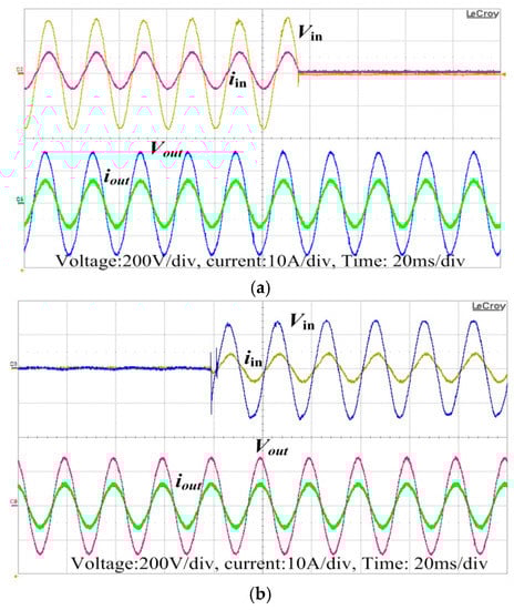 Transition between two modes of operation, Input voltage Vin and current Iin, Output voltage Vout and current Iout. (a) Grid to battery mode and (b) Battery mode to grid mode.