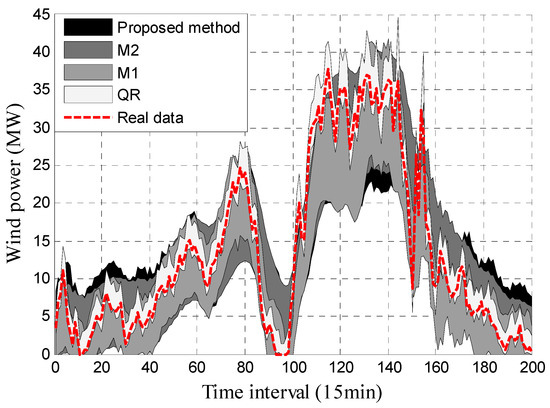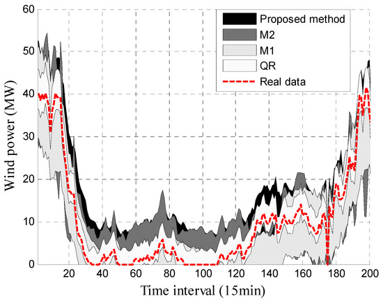 - In terms of the reliability (the closer the PICP is to the PINC, the better), almost all the predicted results of the proposed method, M1 and M2 are closer to 90% than the results of QR. The maximum values of the proposed method, M1, M2 and QR are 92.5%, 92.54%, 92.65% and 100%, respectively, and the minimum values of the proposed method, M1, M2 and QR are 88.25%, 87.5%, 87.54% and 82.72%, respectively. The ACPE values of the proposed method, M1, M2 and QR are 1.514, 1.56, 1.531 and 6.209, respectively, indicating that the overall reliability of the proposed method is comparable to that of M1 or M2, and the performance of the proposed method is slightly better than the other two methods. It can also be deduced that the QR approach has the worst performance as its ACPE value is the biggest.