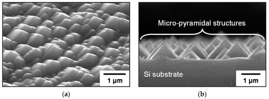 The morphology of the micro-pyramidal structures on the Si substrate surface was confirmed by tilted top-view and cross-sectional SEM micrographs, as shown in Figure 2a,b, respectively. The micro-pyramidal structures were found to be uniformly formed across the substrate surface. We confirmed that such micro-pyramids were heterogeneously distributed on the substrate surface when only the KOH solution was used. The good arrangement of the micro-pyramids is attributable to the pure etch TAD80 mixed with KOH solution. The pure etch TAD80 acts as a secondary dopant to attach the micro-mask onto the Si substrate surface and to dissociate bubbles on the sample surface, which happens during alkaline etching of the Si layer. These behaviors facilitated the adequate alkaline etching of the Si layer according to the (111) crystal orientation corresponding to facets of the micro-pyramids, thereby enabling the formation of high-density textured pyramids. The average width and average height of the obtained micro-pyramids were 0.8 μm and 1 μm, respectively.