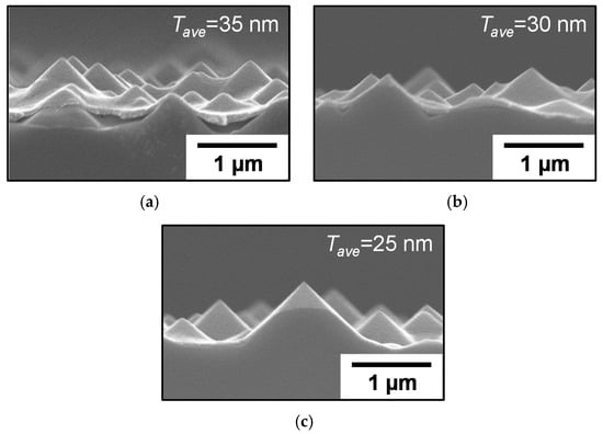 The morphologies of the PEDOT:PSS layers on the micro-pyramidal surfaces fabricated at spin speeds of 1900, 3800, and 7500 rpm were observed by the cross-sectional SEM micrographs, shown in Figure 3a–c, respectively. The PEDOT:PSS layers show smooth surfaces without any cracks for all spin speeds. However, the spin speed strongly affected the adhesion and thickness of the PEDOT:PSS layer. At 1900 rpm, it was very difficult for the PEDOT:PSS to penetrate into the narrow valleys of the micro-pyramids during spin coating, although the PEDOT:PSS layer could be coated on the micro-pyramidal surfaces. In the case of the low spin speed, the PEDOT:PSS cured around the upper parts of the micro-pyramidal surfaces. As a result, voids formed in valleys of the micro-pyramids, as shown in Figure 3a. Increasing the spin speed to 3800 rpm improved the penetration of PEDOT:PSS into the valleys of the micro-pyramids because of the increase in both centrifugal force and capillary force, resulting in a reduction in the number of voids, as shown in Figure 3b. At 7500 rpm, the voids completely disappeared, as shown in Figure 3c. The perfect adhesion of the PEDOT:PSS layer throughout the micro-pyramidal surfaces is mainly due to the enhanced penetration rate of PEDOT:PSS rather than to the hardening rate by the increased centrifugal and capillary forces. Additionally, these spin speeds also affected the thickness of the PEDOT:PSS layer on the micro-pyramidal surfaces. The average thickness (Tave) of the PEDOT:PSS layer decreased from approximately 35 nm to approximately 25 nm with increasing spin speed from 1900 rpm to 7500 rpm. The thickness of the PEDOT:PSS layer plays a significant role in the efficiency of exciton diffusion to a p/n junction interface, corresponding to the micro-pyramidal-structured Si/PEDOT:PSS. The efficiency of exciton diffusion, which causes the generation of charge carriers in the PEDOT:PSS regions, is closely related to exciton diffusion lengths (LD) [14]. The LD is usually a value of less than 20 nm for conjugated conducting polymers [14,15]. From the value of the LD, the PEDOT:PSS coverage fabricated at 7500 rpm enable the efficient generation of charge carriers owing to the favorable exciton diffusion. Further reduction in the thickness of the PEDOT:PSS layer might be facilitated by the generation of charge carriers. However, it was very difficult for the spin coater used in this study to obtain the thickness of less than 25 nm because the maximum spin speed of the spin coater was 7500 rpm. Most importantly, the p/n junction areas, which result in the adequate separation of the photo-generated charge carriers, can be expanded by improving the adhesiveness of the PEDOT:PSS coverage on the micro-pyramidal surfaces. This indicates that it is important to control the spin speed so as to improve the adhesion of the PEDOT:PSS layer across and between the micro-pyramidal surfaces. It was, thus, found that the most suitable condition for PEDOT:PSS coverage onto the micro-pyramidal surfaces was the spin speed of 7500 rpm and its corresponding thickness of approximately 25 nm.