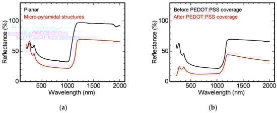 To demonstrate the antireflection effect of the micro-pyramidal structures on the Si substrate surface, reflectance analysis was conducted, and the results are shown in Figure 4a. For the purpose of comparison, the same experiments were also carried out for a planar Si substrate. It can be seen that the planar Si substrate exhibit a strong reflectance of more than 70% in the incident wavelength range above 1100 nm, corresponding to the optical bandgap of Si. However, the reflectance decreased to below 40% in the incident wavelength range 500–1000 nm. As we expected, the reflectance decreased further by the introduction of the micro-pyramidal structures [16], resulting in less than 28% reflectance in the 500–1000 nm wavelength range. This decrease arose from the increased effective optical path length of incident light in the micro-pyramidal structures due to light trapping and light scattering, proving the effectiveness of the antireflection effect. The antireflection effect was further promoted by the PEDOT:PSS coverage onto the micro-pyramidal surfaces. The reflectance properties of the micro-pyramidal structures with and without PEDOT:PSS layer are shown in Figure 4b. The reflectance spectrum (black line) of micro-pyramidal structures before PEDOT:PSS coverage in Figure 4b is identical to the reflectance spectrum (red line) of micro-pyramidal structures in Figure 4a. Interestingly, the micro-pyramidal surfaces with the PEDOT:PSS coating exhibited a remarkably low reflectance below 13% in the incident wavelength range of 500–1000 nm. The stronger suppression of reflectance was achieved through the support of the PEDOT:PSS layer, which has absorption regions at ultraviolet (UV) wavelengths and near-infrared (IR) wavelengths. The PSS component shows intense absorbance in the UV region (an absorption peak at approximately 225 nm) [17] and the PEDOT component exhibits broad absorbance in the near-IR region (an absorption peak at approximately 800–3000 nm) [18]. Therefore, this result demonstrates that the combination of micro-pyramidal structures and PEDOT:PSS coating significantly enhance the antireflection capability of the Si substrate surface.