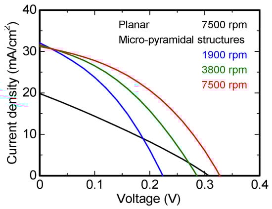 Current density–voltage characteristics of a planar Si/PEDOT:PSS hybrid solar cell fabricated at 7500 rpm and the micro-pyramidal structured Si/PEDOT:PSS hybrid solar cells fabricated at various spin speeds. All of the hybrid solar cells used an Ag rear electrode.