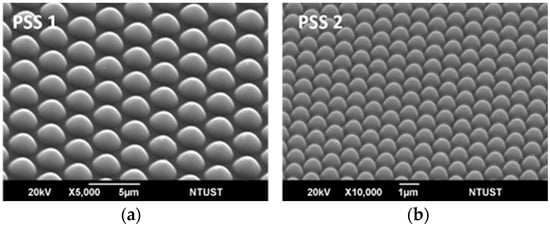 PSS structures (scanning electron microscopy) at two scales: (a) PSS 1: 2.5 μm width, 1.5 μm height and 3.0 μm pitch; (b) PSS 2: 0.9 μm width, 1.5 μm height and 1.0 μm pitch.