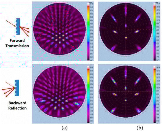 Forward and backward light scattering patterns for a light incident at 30° from the structure surface: (a) PSS 1 and (b) PSS 2.