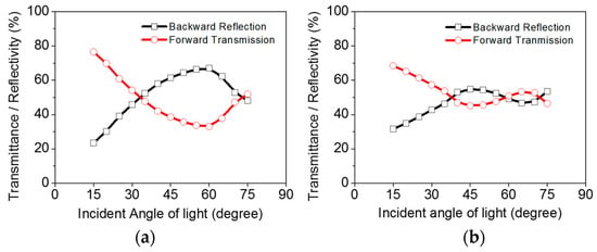 Total transmittance and reflectivity of incident light at different incident angles: (a) PSS 1 and (b) PSS 2.