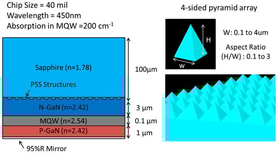 To investigate the influence of the multiscale textured structures on the LED light extraction performance, we use a GaN-based flip-chip LED with a PSS as an example. The LED structure used for the simulation consists of a highly reflective backside mirror, LED epitaxial layers (P-GaN/MQW/N-GaN), and a two-dimensional pyramid-textured PSS with a periodic array structure, as shown in Figure 4. The pyramid structure has a square base with a size of 0.1, 0.5, 1.0, or 4 μm, which ranges from the nano- to the micro-scale. The arrangement is a compact square array and the array pitch is equal to the size of the pyramid structure. Moreover, to unify the parameters of the geometry of textured structures with any scale, we use the aspect ratio, which is defined as the ratio of the structure height to the structure width. Because the base of the structure is fixed, the structure depth and tile angle can be determined simultaneously. The range of the aspect ratio in the simulation was set from 0.1 to 3.0, which means that the scale of the structure depth from micro to nano was also considered.