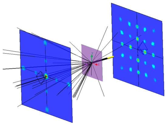 Finally, three-dimensional Monte Carlo simulation was performed using LightTools software (Synopsys, Mountain View, CA, USA) to study the impact of structure texturing on the LED light extraction. The chip size used in the simulation was mil2. The refractive index, absorption coefficient, and other material parameters are described in Figure 4. Only the textured structure was replaced with that of the four equivalent BSDF models. Using the Monte Carlo method, the distribution and direction of light rays are generated randomly within the active region. In general, for each ray, the trajectory and energy are determined by Snell’s law, the Fresnel reflection, and the material absorption. However, when a ray impinges on the interface of the virtual structure surface, the ray is split into more rays, including reflected scattered rays and transmitted scattered rays, which are represented by ray data within the bidirectional reflectance distribution function (BRDF) model, as shown in Figure 7. Accordingly, whether the textured structure is in the micro- or nano-scale range, the LEE of the LED can be effectively evaluated and analyzed using the hybrid method.