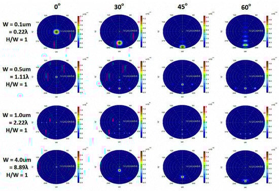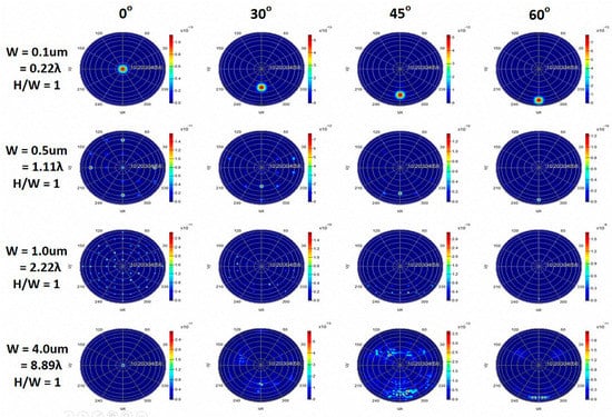 Based on the FDTD method, the light scattering far-field angular distribution of FT and FR resulting from the interaction of textured structures of various scales when the aspect ratio is equal to one at different incident angles is shown in Figure 8 and Figure 9, respectively. Similarly, the simulation results for the behavior of BT and BR have the same variation trend. The figure illustrates that the main difference between various scattering effects lies in the fraction of the emission wavelength (450 nm) at different structure sizes. The feature size of the textured structure set in the simulation covers a wavelength scale range of 0.2 λ to 9 λ. For 9λ, which is a micro-scale structure, we observed that the optical diffusion effect of the reflected field was stronger than that of the transmitted field. When the structure size was reduced to the near-wavelength scales 1 λ and 2 λ, for both the transmitted and reflected fields, the diffraction grating effect became dominant and therefore the light scattering could no longer be described by the refraction process. If we further refined the structure size to the subwavelength scale (i.e., 0.2 λ), the wide-angle antireflection, also called transparent enhancement, effect was observed []. From the preceding conclusion, we can identify the differences in the scattering caused by various scales of the microstructures. We further simulated the LEE of the LED with the hybrid method and summarized the impact of the effects of the scattering on the LEE. We also analyzed the aspect ratio parameter of these microstructures of various scales as an example to identify the optimal LEE using the hybrid method.