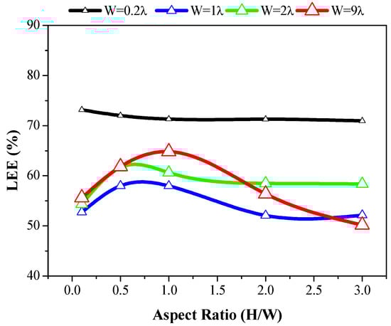 Next, the LEE of a packaged LED was analyzed, yielding the results shown in Figure 11. We adopted hemisphere lens packaging. The diameter of the hemisphere was set at 10 times the size of the LED die. The purpose of this was to eliminate the effect of total internal reflection caused by the packaging. The figure reveals that the LEE trend of the packaged LED was similar to that of a bare chip, and the overall LEE of all the textured structures was enhanced because of the change in the refractive index. Regarding the bare chip, the near-wavelength structures have the lowest LEE, and the subwavelength structure maintains a higher LEE at all aspect ratios. However, the LEE of the micro-scale structure is higher than that of the near-wavelength structures when the aspect ratio is between 0.3 and 1.4. From [,], we can infer that the micro-scale structure results in the backward scattering of light. The scattered light that is reflected back changes the path, thus increasing the likelihood of the light entering the light emission cone, especially in packaged LEDs. That is, if the light cannot be emitted the first time, there is still a chance that the reflected light can be extracted after it changes course and is reflected again at the bottom. Such cycles facilitate achieving a high LEE. This means that the reflectivity of the bottom of the LED is key to the enhancement of the LEE.