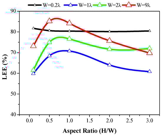 Figure 10 depicts a plot of the calculated LEE of the bare LED chip as a function of the aspect ratio for different structure sizes. For the 9 λ micro-scale structure, the results show that the LEE has a strong dependence on changes in the aspect ratio. As the aspect ratio increases from 0 to 1, the LEE increases, and the LEE reaches a maximum when the aspect ratio approaches unity. When the aspect ratio is greater than unity, the LEE begins to decline. When the textured structure size is one to two times the wavelength scale (i.e., 1 λ and 2 λ), the LEE trend for the different aspect ratios is similar to that of the preceding case for the 9 λ micro-scale structure. However, for these near-wavelength structures, their overall LEE is lower than that of the micro-scale structure, especially when the structure size is close to the emission wavelength. These observations reveal that the LEE is suppressed in the presence of a strong diffraction effect, which can substantially inhibit the LEE enhancement from the near-wavelength structures. For the 0.2 λ subwavelength structure, the LEE shows less dependence on the aspect ratio of the structure, and the LEE is effectively increased because of the antireflection in the wide-angle range; this causes the light extraction enhancement revealed by our simulation results. Comparing the structure scales in the micro to nano range indicates that a nanotextured structure has the highest LEE in a bare chip.