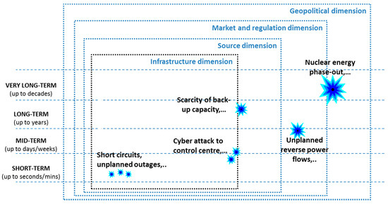 - A multi-stakeholder and multi-disciplinary problem. Numerous and diversified players interact in different fields, spatial scales and time frames of the electricity security problem. Electricity security stakeholders with different backgrounds, interests and expertise fields (political, economic, regulatory, scientific, technical, etc.) are involved in observing, assessing and safeguarding electricity security. They include: scientists, academics, project developers, policy decision makers, regulators, practitioners, system operators, market operators, generation companies, asset owners, aggregators, manufacturers, consumers, emerging actors (offering new services and/or proposing new business models) [23,24,25,26].