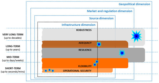 - Flexibility is the short-/mid-term electricity security linked to events (e.g., unpredicted variability of renewable energy) mainly occurring in the infrastructure, source and market and regulation dimensions.