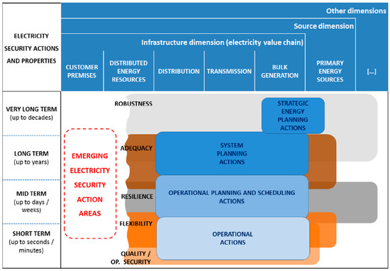 - A multi-action problem. Decision makers can promote/deploy several courses of actions to prevent, mitigate and respond to electricity security threats. Depending on the time scale, stakeholders can resort to operational actions, operational planning and scheduling actions, system planning actions, strategic energy planning (and engineering design) actions to safeguard electricity security [15,16].