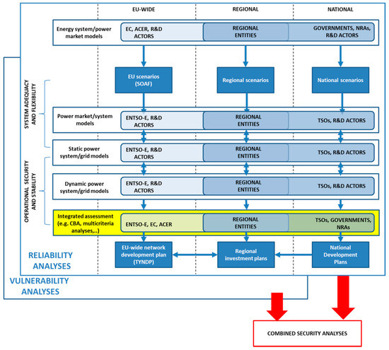 - At the EU level, the main actors are the European Network of Transmission System Operators for Electricity (ENTSO-E), the Agency for the Cooperation of Energy Regulators (ACER) and the European Commission. ENTSO-E is tasked to perform EU-wide analysis and coordinated national/regional studies. ENTSO-E is progressing well in combining primarily static power system/grid models with power market/system models. As explained above for the regional scale, the electricity security models are used for supporting decision making (especially) on operational planning and scheduling actions and system planning actions, (rather than on) operational actions and strategic energy planning actions. In the scientific area, several R&D projects produce advanced models although with partially representative datasets (in the absence of formal agreements with the system operators/data owners). Probabilistic approaches (vs. deterministic ones) begin to be proposed in the reliability assessment area, particularly for power system adequacy and flexibility. As for vulnerability, the Critical Infrastructure Protection initiatives have mainly encouraged bilateral instead of truly supra-national cooperation. At this level, the visibility/observability of dynamics/issues occurring at regional/local level is somewhat limited [71,72,73,74]