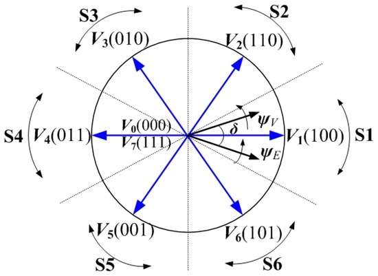 The system variables that need to be predicted are the inverter flux amplitude |ΨV| and the power angle δp. According to Equation (5), we have = + VTs, where Ts is the sampling period and V is the possible inverter voltage vectors. As explained before, V can be controlled to eight space voltage vectors, depending on the switching states. The inverter flux vector can be predicted using α and β components as: