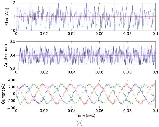 The system steady-state performance is shown in Figure 6. From top to bottom, the curves are the inverter flux magnitude, power angle, and inverter output line currents, respectively. The referenced values of the inverter flux magnitude and power angle are set to 11 Wb and 0.4 rads, respectively. It can be seen that by controlling the VSI with SDFC, both the inverter flux amplitude and power angle present a large amount of oscillations and ripples, though they can track their references roughly. Hence the line currents, i.e., the currents flowing from the DG to the grid, are seriously distorted. As explained previously, these are the main disadvantages of the conventional inverter flux control because the voltage vector applied in every sampling period is not necessarily the most effective one. For grid-tied DG systems, the injected currents should be as sinusoidal as possible. Otherwise, the power quality will be deteriorated by such distorted current components. Consequently, the grid stability will be affected, and additional power losses will be produced. On the other hand, after using the proposed PDFC, it can be observed that the flux amplitude and power angle are much better controlled with a significant ripple reduction. In addition, the line currents are also more sinusoidal than those of SDFC.
