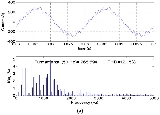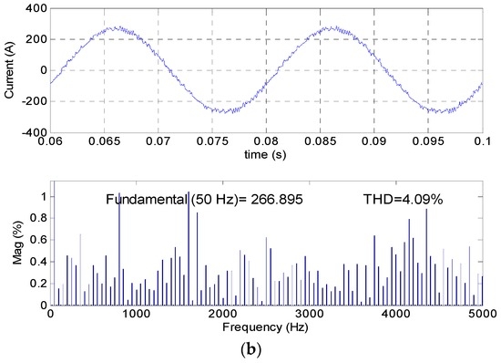 To obtain a better comparison in terms of line currents, the zoom-in waveforms and the harmonic spectrum are plotted out in Figure 8. It can be seen that the current when using the PDFC strategy is much more sinusoidal than that when using the conventional SDFC method. The total harmonic distortion (THD) of the line current for PDFC is 4.09%, much less than the 12.15% for SDFC. This is a significant improvement of the grid-connected DG system by using the inverter flux control approach.