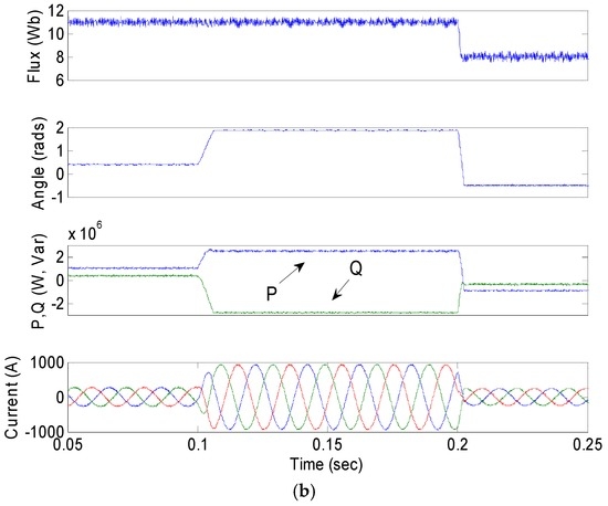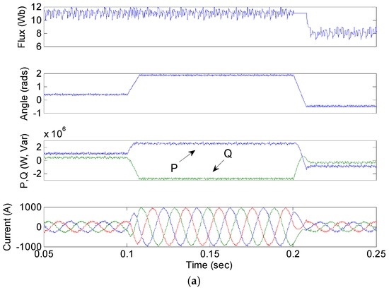 To further verify the reliability of the proposed inverter controller, the dynamic response is tested under the command of the stepped change of the flux magnitude and power angle. The flux amplitude reference steps down from 11 Wb to 8 Wb at a 0.2 s, while the power angle reference steps up from 0.4 rads to 1.9 rads at 0.1 s and steps down to −0.5 rads. It can be seen from Figure 9 that the flux magnitude and power angle can reach the new state in a safe manner without causing dangerous overshoot currents for both methods. However, the flux amplitude and power angle in PDFC can track the reference more quickly, especially during the reference stepping down. Besides, smaller active and reactive power ripples of PDFC can also be observed. It is worth mentioning that the active power becomes negative when the power angle (δp = δV − δE) is controlled to be less than zero. This indicates that the VSI system supplies the power from energy resources to the grid if the inverter flux vector lags behind the grid flux vector.