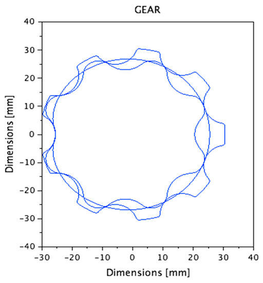 Once basic geometrical parameters are defined, the well-known formulae for calculating the trochoidal profiles of the internal gear are used. In addition, these parameters can be introduced in specialized free software, such as GeroLAB [17], which will calculate and provide the technical drawings in CAD format (see Figure 2).