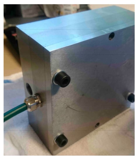 The working pressure was settled by a Wandfluh® (Wandflluh AG, Frutigen, Switzerland) manual direct operating valve (DOV). The working fluid was Hydrolubric ISO VG 32 hydraulic oil with a viscosity of 32 mm2/s at 40 °C. The experimental tests were performed at a constant temperature of 30 °C measured by using a PT100 resistance temperature detector (T) in a three-liter reservoir. The 860 kg/m3 working-fluid density was measured with a hydrometer. Before starting the experimental procedure, the working fluid was filtered at 5 μm with a Millipore® vacuum filter holder to avoid any damage to hydraulic system components.