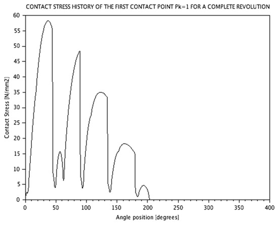 Contact stress history of the first contact point (Pk1 in Figure 1) for a complete revolution of the outer gear [17].