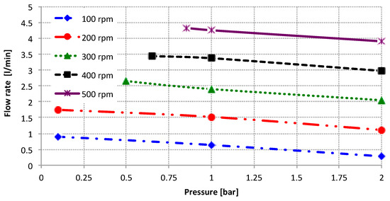 Figure 13 and Figure 14 show the main experimental results of the GeroMAG pump. This shows a good quality of behavior in the steady-state flow rate—working pressure. In these first tests, to prove feasibility and technical performance, the rotational speed is limited to 500 rpm and the working pressure up to 2 bar.