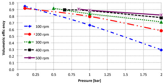 With regard to volumetric efficiency, defined as the ratio between the measured and the theoretical flow rate (=cv·rpm), satisfactory indices are reached, all taking into account the low speed and working pressure settings. The volumetric efficiency is low at 100 rpm and 2 bar working pressure, predominantly owing to the leakage produced in the clearances of the trochoidal gear and housing. When the trochoidal gear tries to pump the fluid against 2 bar working pressure with such low rotational speed, the fluid is mostly kept inside the volume chambers. Moreover, this extremely low rotational speed does not help much with the viscous effect in the dragging velocity of the fluid in contact with the trochoidal gear. Another important effect at low rotational speed is the difficulty of achieving an effective hydrodynamic effect and full film lubrication at all times of operation. For all of these main reasons, the volumetric efficiency is around 30%. However, from 100 rpm to 200 rpm, the speed and volumetric efficiency are doubled, and an acceptable value of 82% for 500 rpm at 2 bar is reached.