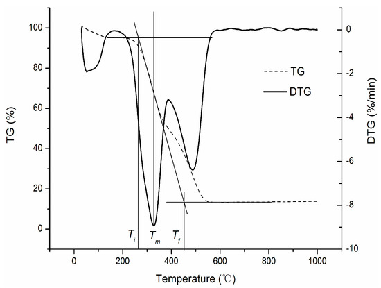 Ignition temperature Ti is not a physical characteristic of any kind of fuel [15,16]. Ti is applied to the evaluation of different specimens for the same combustion procedure or operational conditions in order to compare their reaction activity. Ti and burnout temperature Tf, from the DTG and TG curves, can be determined according to Figure 1 [17,18].
