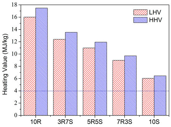 Figure 2 shows the LHV and HHV of different mixtures. Without the addition of fuel, the blends required an LHV of >3 MJ/kg for incineration; an LHV of >4 MJ/kg was required for waste-heat utilization. In order to ensure auto-thermal combustion, an LHV of higher than 4 MJ/kg is recommended [24]. The LHV of rice husk and sewage sludge blends indicates that waste sludge is suitable for co-combustion with other fuels, such as rice husk, to minimize its high ash content risk and potential environmental problems. The element analysis showed that rice husk has higher hydrogen content than sewage sludge. The combustibility of a fuel increases with higher hydrogen content. Therefore, it is expected that the blending of higher hydrogen and volatile content rice husk with sewage sludge will result in the enhancement of ignition.