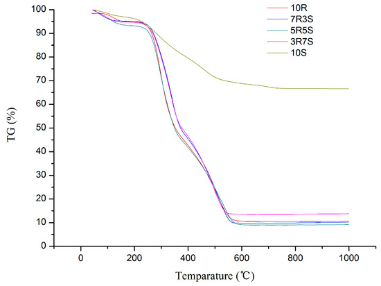 Combustion thermal gravity (TG) profiles of rice husk–sewage sludge with different sludge ratios.