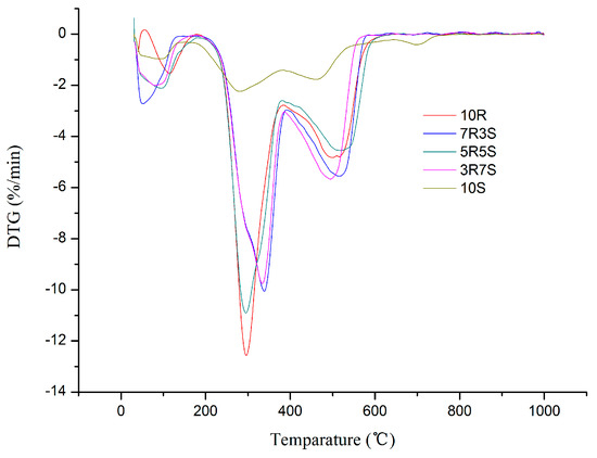 Combustion differential thermal gravity (DTG) profiles of rice husk–sewage sludge with different sludge ratios.