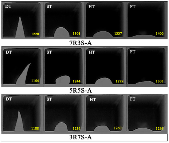 Among the characteristics of biomass, the relationship between ash melting point and slag is the most direct. Melting characteristics of biomass are key indexes of thermochemical treatment. Macroscopically, melting characteristics can be used to determine the hazardous level of ash deposition and slagging in the process of biomass combustion. Therefore, it is very important to investigate the melting characteristics of biomass, especially blended biomass. The melting characteristics of the mixtures of rice husk and sewage sludge are presented in Figure 6.