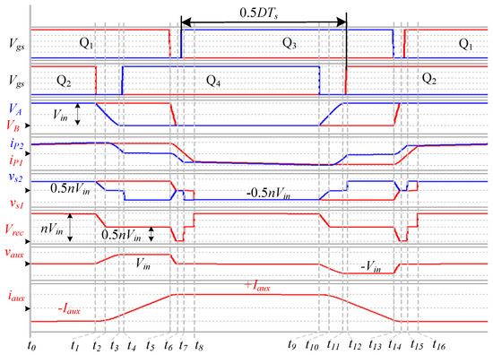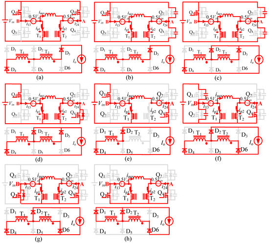 Figure 2 shows the key waveforms of the proposed converter in the steady state. D means the duty-cycle and Ts is the switching period. All the primary switches’ duty-cycles keep constant (50%) if the dead-time is ignored. The output voltage is regulated by adjusting the phase-shift time 0.5DTs between leading-HBI and lagging-HBI. The operating sequence during each switching period can be divided into two half cycles—t0–t8 and t8–t15. Due to the symmetrical structure, only the first half cycle is given. This half cycle can be divided into eight operating modes, whose topological states are shown in Figure 3.