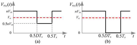 Since the durations of duty-cycle loss and dead-time are very narrow, they can be ignored to simplify analysis. Figure 4a shows the simplified rectifier output voltage in the proposed converter. The voltage gain is derived from the volt-second balance of the output filter inductor, and it can be expressed as follows:
