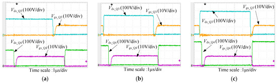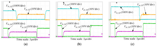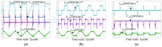 Zero-voltage-switching (ZVS) waveforms at Io = 1 A: (a) Vin = 200 V; (b) Vin = 250 V; (c) Vin = 300 V.