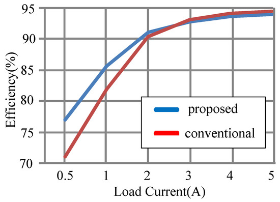 In order to compare the performances, a conventional PSFB converter was built with an external inductance of 20 µH to achieve the ZVS operation over a load range from 50% to 100%. Figure 10 shows the experimental efficiencies of the proposed converter and the conventional converter under different load currents. At heavy loads, both converters could achieve ZVS, while the additional components in the proposed converter increased the conduction losses. Therefore, the efficiency of the proposed converter was a little lower than that of the conventional converter. At light loads, the switching losses were dominant and the conventional converter failed to obtain ZVS. The proposed converter could maintain the ZVS operation and achieve higher efficiency at light loads, as shown in Figure 10. The efficiency improvement was determined by the saved switching losses.