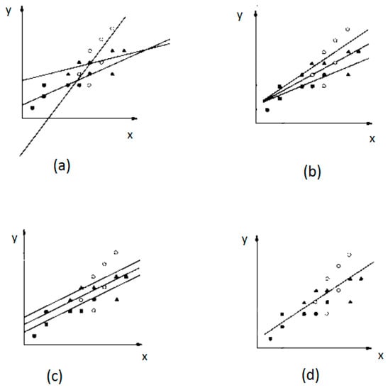 Relation between regression lines. (a) Completely different; (b) intercept (same intercepts); (c) parallel (same slope but without intercept); and (d) coincidence (exactly same lines) [].