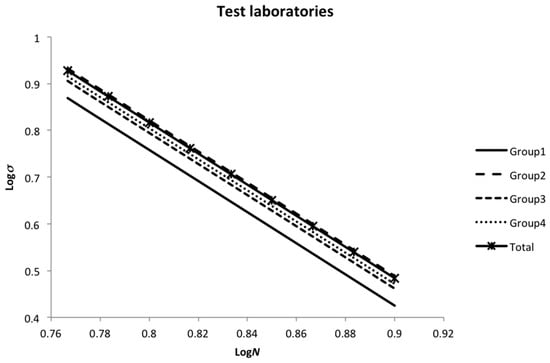 The obtained F was then compared with the critical value of F with three and 822 degrees of freedom and a level of significance equal to 5%; F(0.05, 3,822) equals 2.62, and the null hypothesis of “The choice of test laboratory does not affect the fatigue test results” was rejected. Next, the homogeneity of the slopes of regression lines was considered, i.e., it was tested if the slopes of the different regression lines were equal. The null hypothesis is written: The summary of the calculation is shown in Table 8.