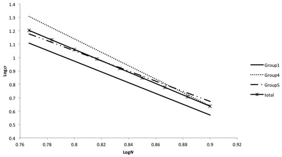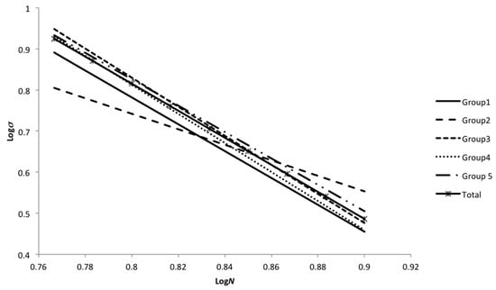 where logNij is the i-th observation on the response variable in the j-th group, logσij is the measurement made on the covariate variable corresponding to logNij, is the mean of the logσij values, μ is an overall mean, τj is the effect/influence of the j-th group, β is a linear regression coefficient indicating the dependency of logNij on logσij, and εij is a random error component. It is assumed that the errors εij are normally distributed with a mean value = 0 and a standard deviation of σε. The null hypothesis is “the group effect is zero ()” and if the null hypothesis is accepted, then logσij is not affected by the groups.