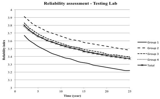 The reliability indices as a function of time for the groups of testing laboratories (Section 5.1) were estimated and are shown in Figure 5. Note that in this figure the annual reliability index is shown. The data from Group 2 result in the largest reliability level compared to the other groups. Moreover, the annual reliability index for cutting samples groups (Section 5.2) is shown in Figure 6. It is seen that the annual reliability indices at the end of the lifetime are of the order of 3.3, corresponding to the target annual reliability index = 3.3.