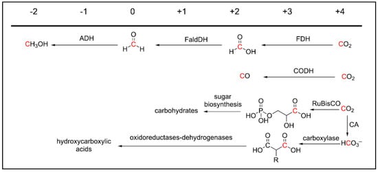 Biocatalytic routes for the conversion of CO2 into compounds with carbon in the reduced oxidation states indicated at the top. FDH: formate dehydrogenase, FaldDH: formaldehyde dehydrogenase, ADH: alcohol dehydrogenase, CODH: carbon monoxide dehydrogenase, RuBisCO: ribulose-1,5-bisphosphate carboxylase oxygenase, CA: carbonic anhydrase, R: H, CH3 [12].