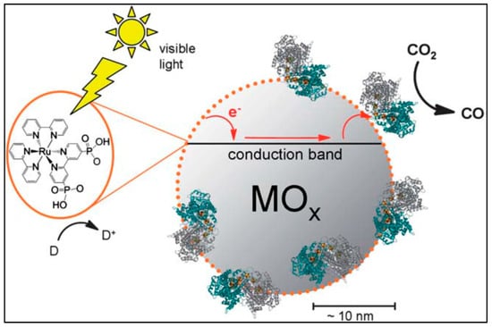 Shin et al. (2003) [21] first found that CODH is a suitable catalyst for electrochemical CO2 reduction, exhibiting almost no overpotential. Woolerton et al. [17,22] discovered an innovative efficient technique that combines photocatalysis efficiently and cleanly in the enzymatic conversion of CO2 to CO. Figure 2 shows the hybrid system comprising metal oxide nanoparticles functionalized with the enzyme CODH, and sensitized to visible light using a ruthenium bipyridyl photosensitizer [22]. Of the semiconductor materials that they investigated, photocatalysts prepared with Evonik Degussa P25 TiO2 (a commercially available 3:1 mixture of anatase/rutile) and ordinary anatase TiO2 nanoparticles were found to be the most effective, in terms of overall turnover rate.