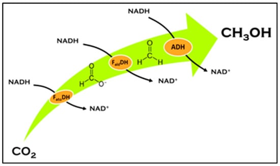 Methanol, a fuel and key starting material for many important industrial applications, can be produced from CO2 reduction. Obert and Dave [7] reported an enzymatically coupled sequential reduction of carbon dioxide to methanol using three different dehydrogenases including FDH, formaldehyde dehydrogenase (FaldDH), and alcohol dehydrogenase (ADH). The overall reaction process, in which terminal electron donor in each dehydrogenase-catalyzed reduction is reduced NADH, is shown in Figure 3 [35].