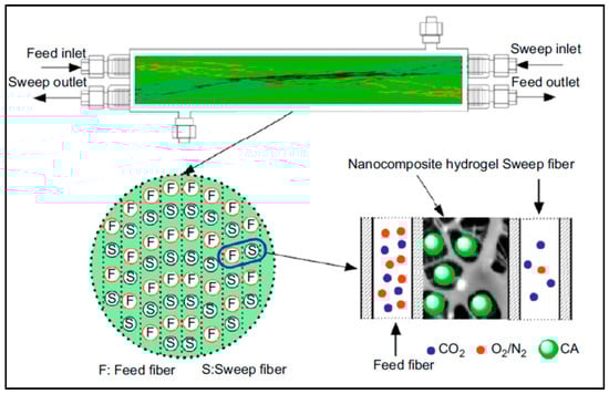 The catalytic conversion of CO2 by CA has been applied to improve the performance of membranes including enhanced efficiency, speed, and increased specificity [57]. This invention is a process for gas separation wherein carbon dioxide in a mixed gas stream is converted to bicarbonate in the temperature range of 40–85 °C. The consequence is that many outlet gas streams such as flue gases can be used directly without the need for heat exchangers or other costly equipment or processes. The selective separation of CO2 from mixed gas streams has been developed using a hollow fiber membrane reactor supported by immobilized CA (shown in Figure 5) [58]. This enzyme-based membrane reactor allows CO2 at low concentrations to be separated from mixed gas streams. However, a variety of major problems including short lifetime, fouling and biofouling, separation of the enzyme from the immobilization surface, have limited the application of these enzymes in industrial settings [57].
