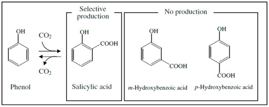 Recently, a new method was explored for the selective and ecological salicylic acid production by the enzymatic Kolbe–Schmitt reaction (as shown in Figure 6) [76]. In particular, salicylic acid decarboxylase (Sdc) is used for producing salicylic acid from phenol. The yeast Trichosporon moniliforme WU-0401 was enzymatically characterized with the Sdc gene heterologously expressed. More recently, Sdc enzyme has also been applied to convert m-aminophenol to p-aminosalicylic acid with a conversion yield of 70% (mol/mol) [77].