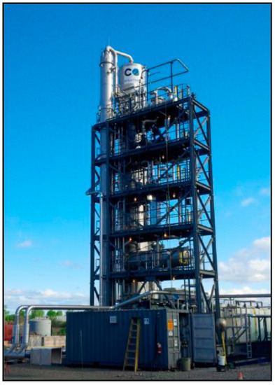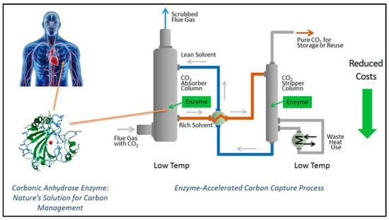 Recently, the Quebec City-based company CO2 Solutions verified the results of a carbon capture demonstration project at Salaberry-de-Valleyfield near Montreal, reporting that CO2 Solutions’ proprietary enzyme performed in a stable manner with negligible solvent consumption and without producing any toxic waste products (shown in Figure 8) [89,90]. Furthermore, a pilot-scale CO2 capture process was constructed at the National Carbon Capture Center in Wilsonville, AL, USA by Codexis Inc., in which the rate of CO2 absorption was enhanced 25-fold compared with the non-catalyzed reaction [91].
