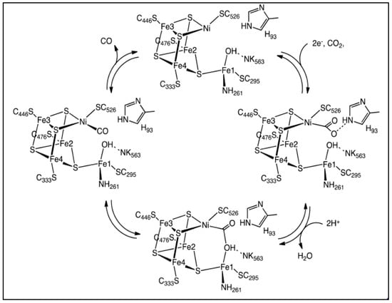 Converting CO2 to carbon monoxide (CO), the feedstock for various synthetic processes, through the production of hydrocarbons (Fischer-Tropsch process), acetic acid (Monsanto and Cativa processes), and methanol catalyzed by carbon monoxide dehydrogenases (CODHs) has received much attention [17,18,19]. There are two types of CODHs including the O2-sensitive enzymes from obligate anaerobes containing [Fe4S4Ni] and air-stable enzymes with [MoSCu] active sites [20]. The [NiFe] CODHs result turnover frequencies for CO oxidation as high as 40,000 s−1 and 45 s−1 for CO2 reduction, while the [MoCu] CODHs do not catalyze the reduction of CO2 to CO [19,20]. The conversion of CO2 to CO is accomplished using [NiFe] CO dehydrogenases with the proposed mechanism presented in Scheme 1 [20].